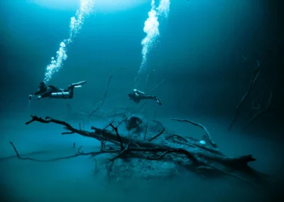 El descenso en el cenote Angelita nos lleva hasta la famosa nube de sulfuro de hidrógeno que crea la ilusión de un río subacuático. La sensación de atravesar esta capa y observar el paisaje surrealista de troncos y sedimentos es única. Este buceo profundo está dirigido a buzos Advanced que buscan una experiencia contemplativa y fuera de lo común.