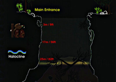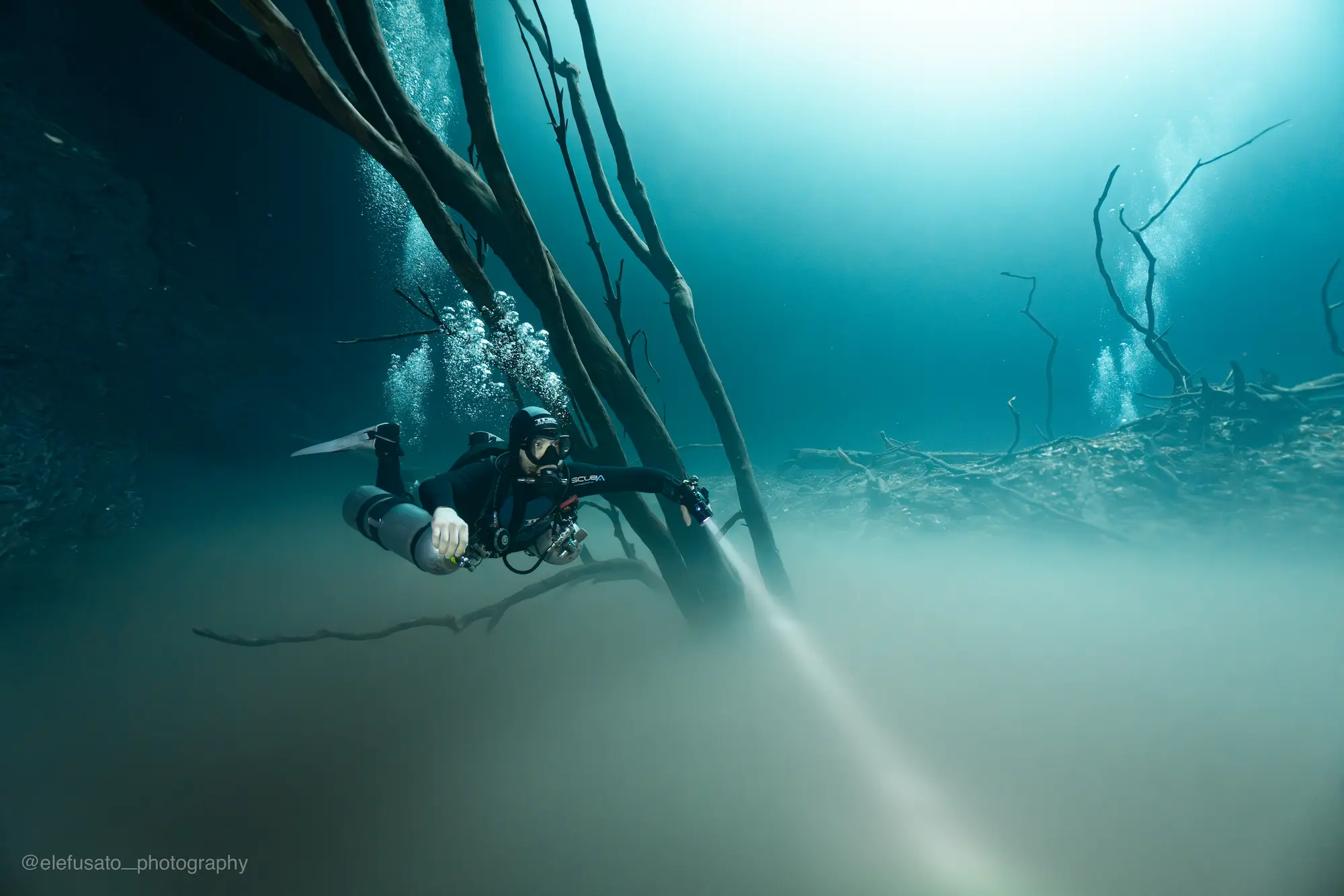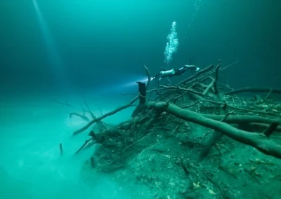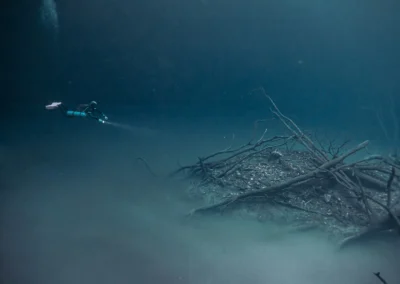 A los 30 m (98 ft) aparece una densa nube de sulfuro de hidrógeno que crea la célebre ilusión de un río subacuático. Bajo ella, una montaña de sedimentos forma una “isla” fantasmagórica con troncos, raíces y restos antiguos. Con visibilidad que supera los 40 m (131 ft) y una profundidad total cercana a 60 m (197 ft), el buceo en cenote Angelita está reservado para buzos avanzados que buscan una experiencia única: flotar entre penumbra y silencio, en un entorno que parece suspendido fuera del tiempo.