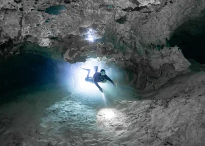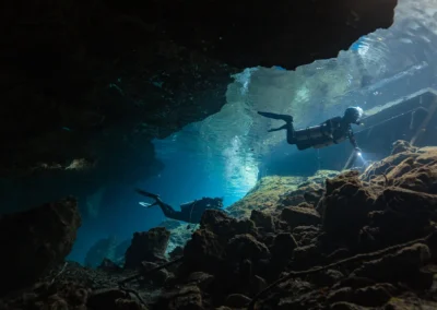 La primera inmersión tiene lugar en The Pit, un cenote profundo y vertical que ofrece un espectáculo de luz natural sin comparación. A medida que descendemos, atravesamos una haloclina perfectamente definida que apreciaremos con más detenimiento en nuestro ascenso, seguimos hasta encontrar en el fondo una capa de sulfuro que crea un contraste visual impresionante. Entre la claridad del agua y las estalactitas colosales, el paisaje subacuático parece suspendido en otro tiempo. Esta inmersión requiere técnica, control y experiencia, pero regala una sensación indescriptible de inmersión total en el corazón de la tierra.