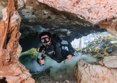 El buceo en The Pit es una de esas experiencias que marcan a todo buzo avanzado. Su descenso vertical y el rayo de sol que penetra hasta el fondo crean un espectáculo natural que deja sin palabras. Las capas de haloclina y sulfuro generan contrastes de color imposibles de describir, mientras estalactitas gigantes se pierden entre la claridad y la sombra. Allí abajo, el silencio se siente diferente, profundo y absoluto.