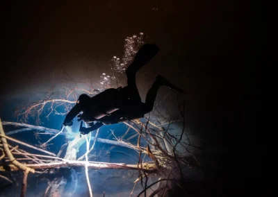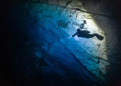 Descendemos por una estructura de madera de más de 18 metros (59 pies) hasta alcanzar la superficie del cenote, un enorme espacio abierto que impresiona por su tamaño y su tono azul profundo. Al saltar al agua y a medida que descendemos, la luz cenital atraviesa la columna de agua y perfila formaciones de estalactitas gigantes. A los 24 metros (78 pies) se cruza una haloclina perfectamente definida, generando ondulaciones y reflejos hipnóticos. Es un buceo avanzado, ideal para quienes buscan perfeccionar su técnica en aguas profundas y disfrutar de un entorno visualmente espectacular.