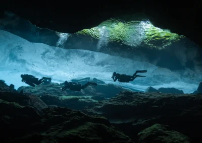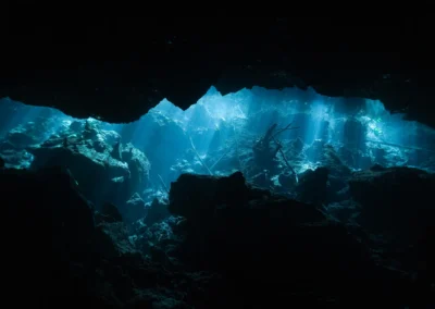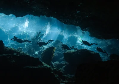 Dos mundos distintos se encuentran bajo la selva maya. Yaakun, con su profundidad azul y sus formaciones monumentales, y Kukulkán, una caverna bañada por haces de luz natural que parecen cobrar vida entre las estalactitas. Juntos, crean una experiencia única que combina la serenidad luminosa y el desafío técnico del buceo avanzado.